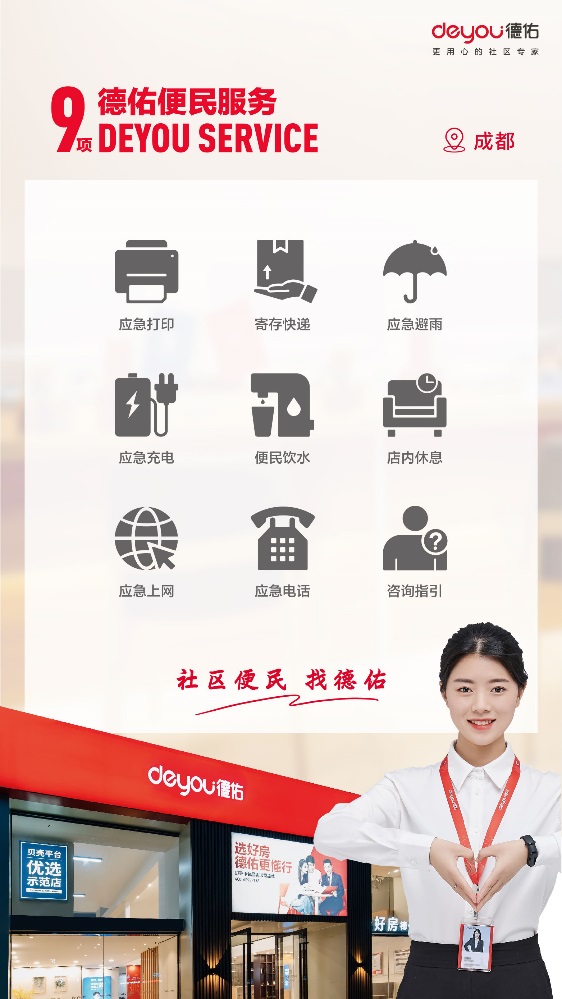 德佑依托于大规模门店和经纪人队伍,积极实施“9大便民服务”,结合地方需求,提供特色社区服务。截至目前,成都德佑已服务社区超过7193个,真正做到了扎根社区,做社区的好邻居。