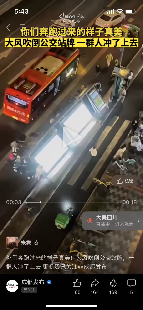 这暖心一幕被热心网友拍摄上传网络,并被“成都发布”官方视频号转载。视频中,在成都一个公交站台前,有人被压倒在公交站牌下,众多市民合力营救。公交站台旁停放着闪烁着应急灯的公交车、出租车、私家车,只见众人一边抬起站牌,一边喊着:“1、2、3,加油!1、2、3,加油!”