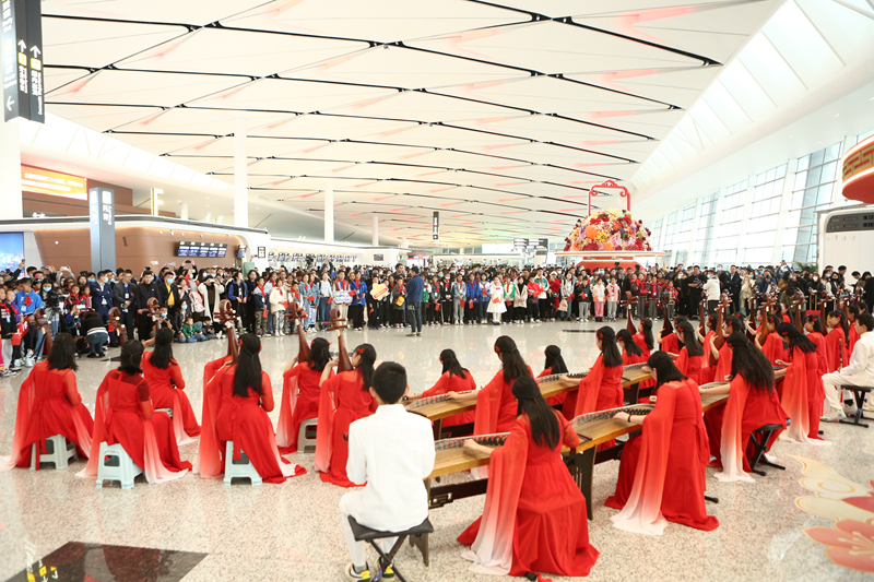3月19日上午,开营仪式在成都天府国际机场举行。来自成都简阳的青少年们以快闪的形式在现场演奏古典民乐《彩云追月》,并与营员们共同唱响《红旗飘飘》。快闪演出旋律悠扬、欢乐动听,展现了新时代四川青少年积极向上的精神风貌,赢得现场群众的热烈掌声。