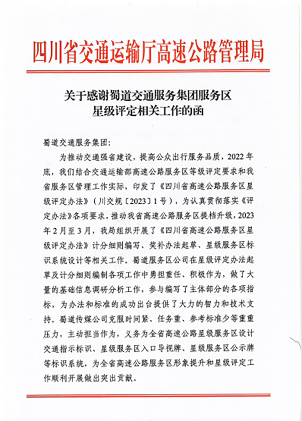 四川新闻网成都3月23日讯 近日,蜀道交通服务集团收到四川省交通运输厅高速公路管理局寄来的感谢信,对公司深度参与、全力配合高管局完成《四川省高速公路星级评定办法》修订相关工作,以及长期以来为全川高速公路行业发展做出的贡献表示感谢。