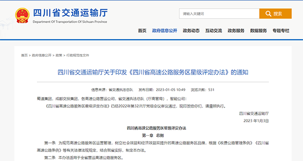 为适应当前发展形势,提高公众出行服务品质,推动交通强省建设,四川省交通运输厅在原有服务区星级评定办法的基础上,结合交通运输部高速公路服务区等级评定要求和全省实际,于2022年初启动修订《四川省高速公路服务区星级评定办法》。目前该办法已完成修订,于2023年1月3日印发,自2月1日起施行,有效期5年。