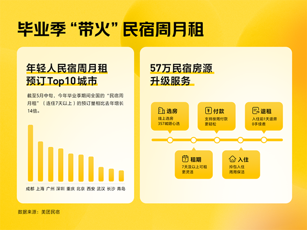 地域上,成都、上海、广州、深圳、重庆的年轻人“民宿周月租”预订最为火热。为保障毕业季、短期实习、工作出差等短期住房需求,美团民宿已在全国357个城市推出“周月租”产品,并将通过流量扶持、快速审核等帮助房东在淡季“解锁”全新客源,获得增量收益。