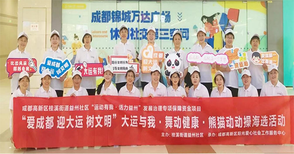 开展运动系列主题活动。近日开展了运动嘉年华、小区趣味运动会、太极拳健身科学培训课、乒乓球交流赛、“爱成都·迎大运·树文明”熊猫动动操海选等活动。