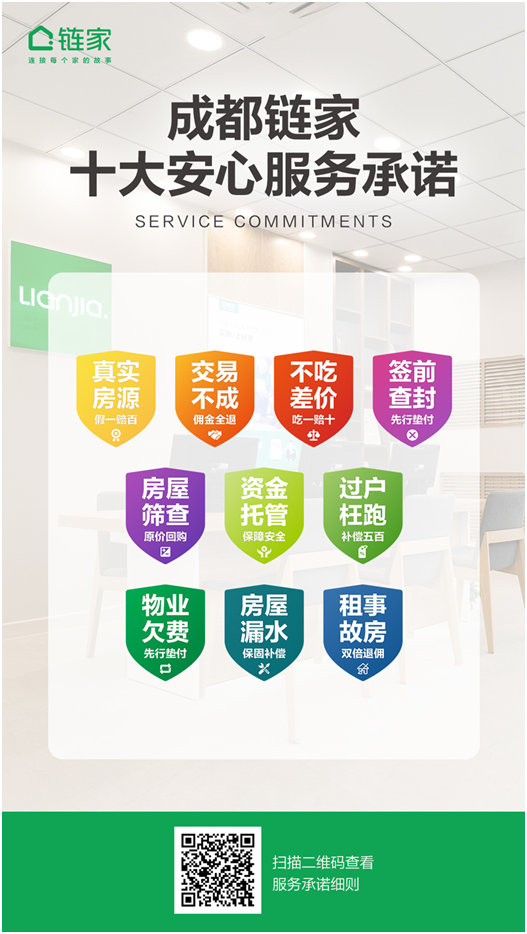 “交易不成,佣金全退”,成都链家承诺:经成都链家居间成交的买卖业务,如最终未能成功办理过户手续,在三方签署解约协议后,费用缴纳方(买受一方或交易双方)所支付的佣金(特指居间服务费,不包含我公司代收且已经支付给第三方的费用,例如评估费等)将由我公司全额返还。截至2023年4月,累计履约11679笔,累计退赔金额34905.41万。