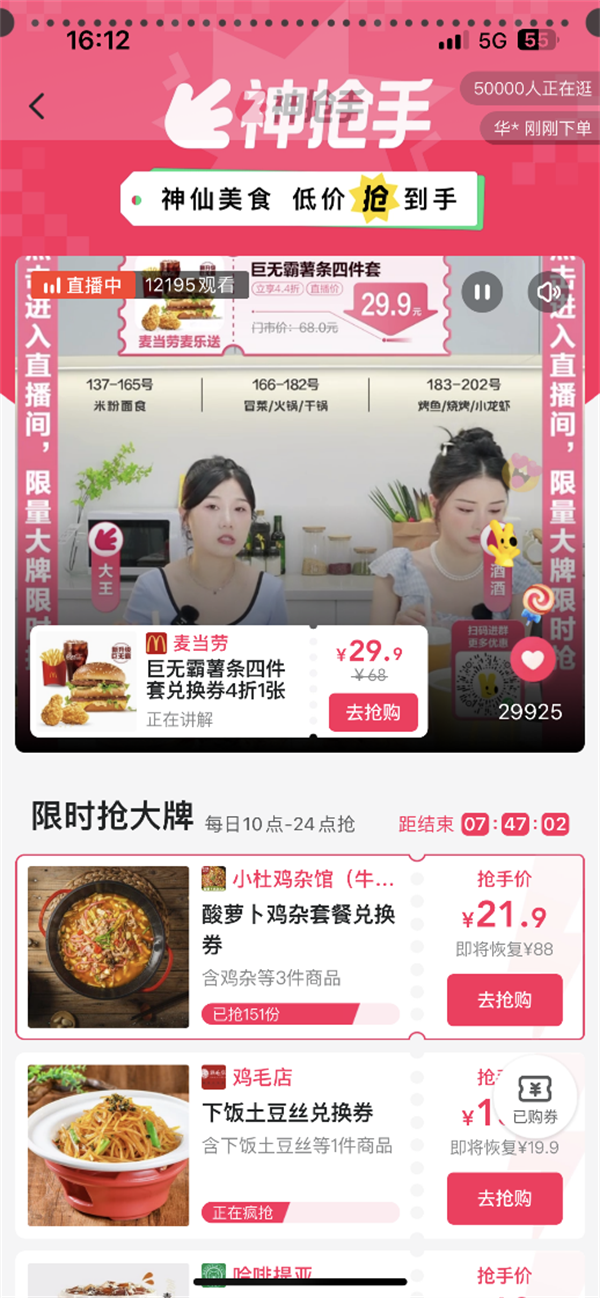 (图片说明:消费者在“神抢手”内,有机会享受到折扣力度更优的餐品或兑换券,可即时消费,也可“囤货”)