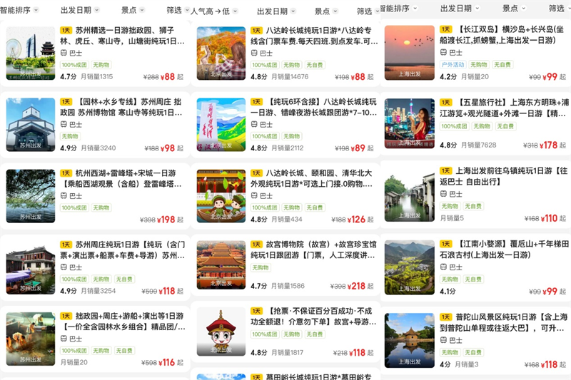 美团平台上,全国各地一日游线上供给丰富、销量火爆。
