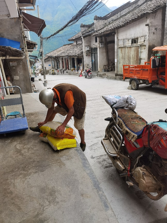 从成都来的货车驶到门口,卸下前一天村民们购买的东西,水果、蔬菜、牛奶、香肠、还有肉类鱼虾……他对着订单挨个分装,牛奶不能挤压,海鲜要单独包装,香肠、馒头这些速冻食品要放进冷冻柜里。店里虽然只有40平,但还添置了单独的冰柜,放团购的冷冻商品。