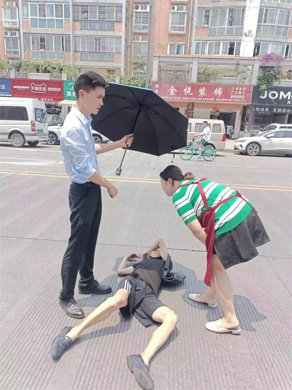 一路小跑出去,看到一位大概60岁左右的老人躺在滚烫的马路上。杜伟峰心想,自己身为共产党员,有义务伸出援手。他和邓亚相视一眼后,两人一齐往老人身边走去。但是,尝试唤醒老人无果,同时担心是其他疾病引起的晕厥,他们不敢贸然挪动老人身体,只能先用伞遮挡阳光。随后电话联系了120、110以及老人的家人,也就发生了照片里抓拍那一幕。
