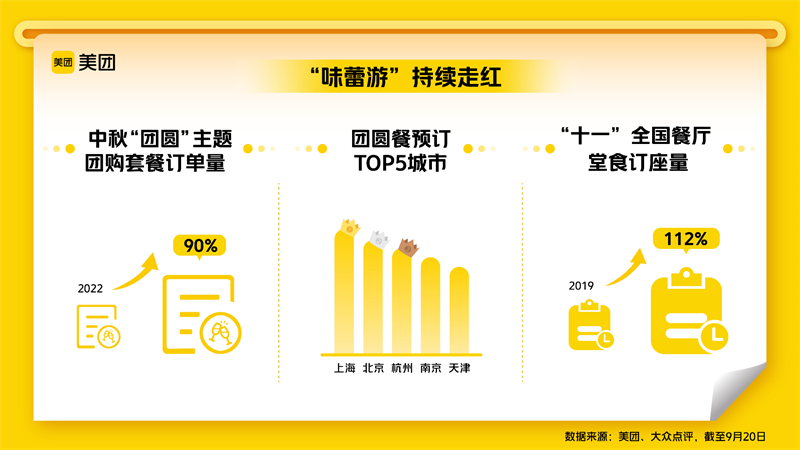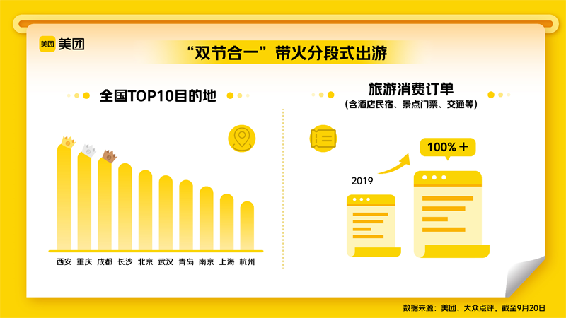 美团、大众点评数据显示,预计9月30日-10月2日为中秋节后首波出游小高峰,北京、成都、上海、深圳分别为出发与到达“双向”热门城市。同时,长途出游的住宿订单占比超过2019年同期,西安、重庆、成都、长沙、北京、武汉、青岛、南京、上海、杭州成为十大热门目的地城市,东南亚、日韩为热门出境游目的地。
