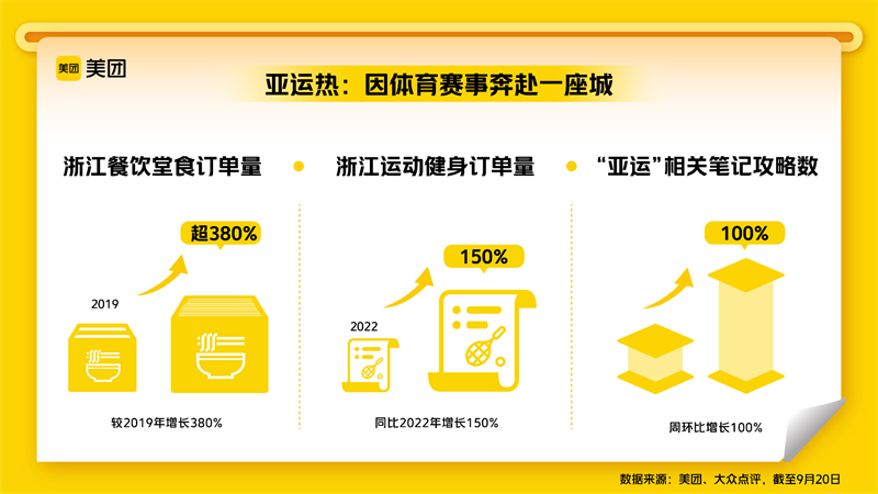 “因体育赛事奔赴一座城”成为今年的亚运“限定”,为国庆旅游再添“一把火”。美团、大众点评数据显示,截至9月20日,浙江餐饮堂食的订单量较2019年同期增长超380%,主办城市杭州以及宁波、温州、湖州、绍兴、金华等协办城市的酒店、民宿“一房难求”,杭州跻身国庆铁路热门TOP10目的地。