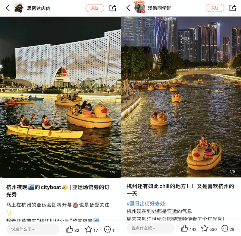 亚运热辐射整个浙江区域,赛事“流量”将变成文旅“留量”。“晚上去钱江世纪公园,59.9元就能划船,看灯光秀。”“来杭州搞一场City Boat”正成为年轻人沉浸式参与亚运、深度探索杭州的新方式。