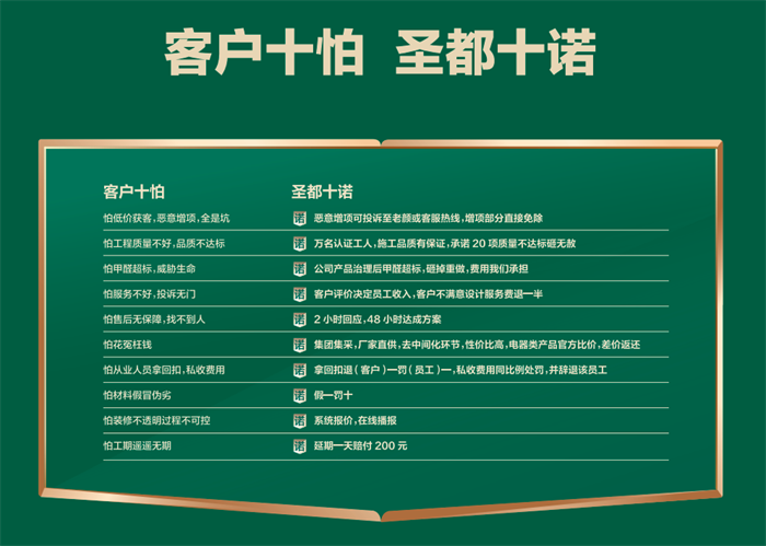 “和链家一样,首先圣都在装修前中后期全面严控品质,保证结果让客户满意;即便出现品质纰漏也不怕,圣都有‘十怕十诺’和‘20项砸无赦’,保证消费者的权益不会损失。怕恶意增项全是坑,圣都承诺0增项,恶意增项可投诉至圣都创始人颜伟阳直达号,增项部分直接免除;怕工期太长影响入住,圣都承诺延期一天赔付200元。”强大的保障与赔付体系是经纪人的底气,也是客户的“安全感”。