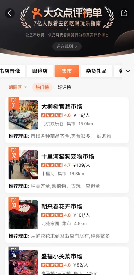 ▲大众点评上的北京朝阳区“集市热门榜”榜单(图源:大众点评)