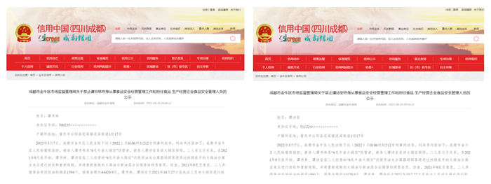 公示曝光典型案例,让严违失信无处遁形。通过信用中国(四川成都)网站,对禁止谭书林、谭诗安终身从事食品生产经营管理工作和担任食品生产经营企业食品安全管理人员进行公示曝光,形成对违法失信行为的有力震慑。