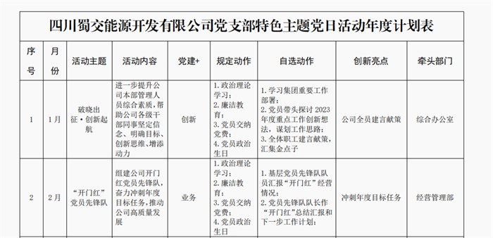 定好每月主题,建立长效机制,深化拓展主题党日活动规范性、实效性,将主题党日作为落实基层党建的有力抓手。把准重要定位,突出新理念。改变传统单一的理论学习模式,规范“5+4+N”工作方法,“5”即公司5个职能部门,“4”即 4个规定动作;“N”即 N 个自选动作,鼓励各部门创新活动主题,将冲刺年度目标任务、提升安全管理水平、实现降耗增效等内容融入主题党日活动,丰富活动内容。瞄准工作方向,开拓新局面。按照“一月一主题”目标,每月初结合当月工作实际,将主题党日与当前重点工作有效衔接,开展“破晓出征·创新起航”交流研讨,党员带头探讨 2023年度重点工作,谋划工作思路,收集建言献策40条,精选“金点子”5个。组建“开门红”党员先锋队,围绕冲刺年度目标任务作“开门红”总结汇报和下一步工作计划,树立“抓大经营、抓大项目、抓大创新、抓大保障”的工作思路。找准主题党日活动切入点、结合点,将主题党日与经营发展相结合,积极推动党建工作与业务工作双融双促。创新活动延伸,构筑新高地。在突出抓主题党日活动的同时,思考构建党建特色品牌,以特色党建领航定向,打造坚强战斗堡垒。创建“红色堡垒、能源尖兵”党建品牌,实施开展“堡垒工程”“尖兵工程”行动,列出两项工程实施内容30余项。编写公司《党支部标准化工作手册》,系统回答公司党支部“干什么”“如何干”。