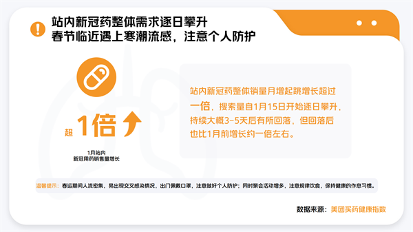 根据美团买药健康指数,当前流行病依然以流感为主,新冠有一定上扬的势头,但整体上还处于较低水平。疾控中心专家研判认为,冬春季将继续呈现多种呼吸道疾病交替流行或者共同流行的态势。