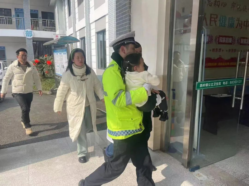 2月12日15时许,在西岭镇卫生院门口,交警谭东中队辅警王靖允抱着一名孩子焦急地呼叫:“医生,快来一下,嘴角一直在流血,这个娃娃刚摔倒了......”。
