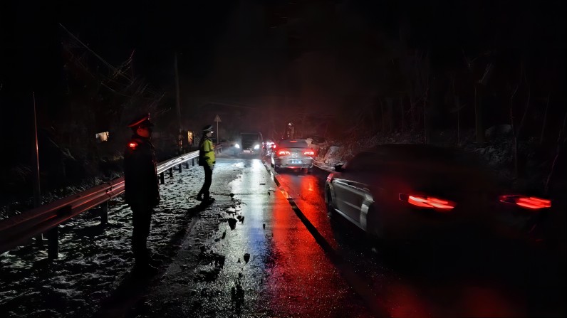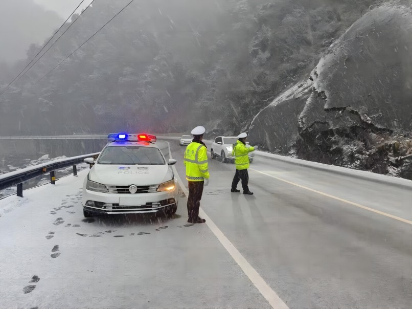 四川新闻网成都2月25日讯 受冷空气影响,大邑县出现新一轮低温冰雪天气,2月23日高海拔区域再次迎来降雪,部分路段出现道路结冰现象,影响安全通行,给出行的车辆和行人带来了诸多不便。大邑公安交警谭东中队第一时间迎雪而上,昼夜坚守在大双公路,及时启动恶劣天气应急预案,积极应对道路结冰、视线受阻等复杂路况,加强巡逻管控,滚动安排警车开启警灯全天候上路巡逻,加大易积雪、易结冰路段的指挥疏导。执勤民辅警顶着凛冽的寒风,对过往车辆进行指挥、提醒,并联合相关部门撒盐除雪,及时发现和处置各类道路险情,全力消除安全隐患,确保雪天交通安全、有序、畅通。强降温天气影响以来,交警谭东中队出动 45人次,警车10台次,警摩5台次。