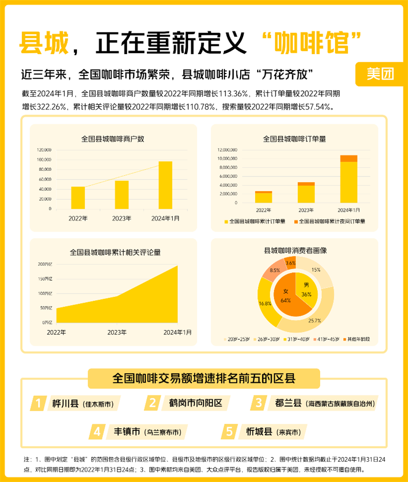 3月12日,美团发布《2024县城咖啡新业态报告》(以下简称《报告》)显示,近三年全国县城咖啡商户数量稳步增长,截至2024年1月,县城咖啡商户数量较2022年同期增长113.36%;县城咖啡累计订单量较2022年同期增长322.26%,较2023年同期增长136.37%。