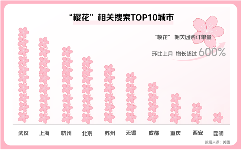 美团、大众点评数据显示,3月以来(截至21日),樱花相关搜索量环比增长146%,TOP10搜索城市分别是:武汉、上海、杭州、北京、苏州、无锡、成都、重庆、西安、昆明。其中,“东湖樱花园”“武汉欢乐谷(樱花季)”“武大樱花”均为关联热搜词。东湖樱花园位于东湖磨山景区南麓,园中有樱花品种80余种,数量1万余株。这里是全国垂枝樱花数量最多、最集中的地方,夜樱更是全国闻名,成为游客春季踏青的热门目的地。