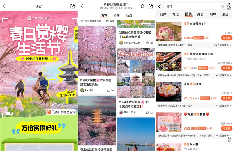据悉,为了进一步便捷“樱花游”吃喝玩乐行的方方面面,大众点评在武汉上线了“春日赏樱生活节”活动。一大批本地笔记作者,充当起“赏樱课代表”,为游客提供第一手赏花资讯,以及更地道的“本地私藏版”赏花指南。本地各类美食商户成为大众点评此次春日赏樱生活节的“赏樱赞助人”,为游客提供高性价比的团购套餐。此外,大众点评还联合全城多家品牌,600余家门店,为游客提供饮水点、免费行李寄存等服务。