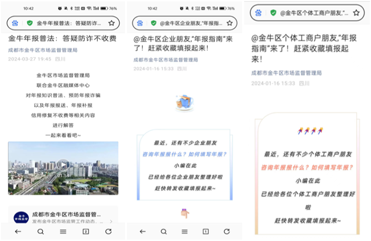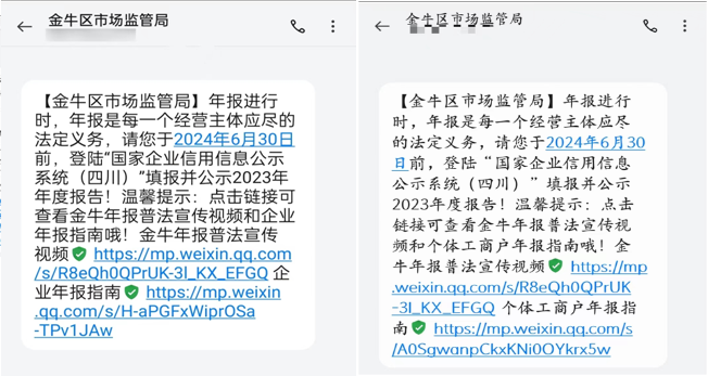 “【金牛区市场监管局】年报进行时,年报是每一个经营主体应尽的法定义务,请您于2024年6月30日前,登陆‘国家企业信用信息公示系统(四川)’填报并公示2023年年度报告!温馨提示:点击链接可查看金牛年报普法宣传视频和企业年报指南哦!金牛年报普法宣传视频 https://mp.weixin.qq.com/s/R8eQh0QPrUK-3l_KX_EFGQ 企业年报指南https://mp.weixin.qq.com/s/H-aPGFxWiprOSa-TPv1JAw ”和“【金牛区市场监管局】年报进行时,年报是每一个经营主体应尽的法定义务,请您于2024年6月30日前,登陆‘国家企业信用信息公示系统(四川)’填报并公示2023年度报告!温馨提示:点击链接可查看金牛年报普法宣传视频和个体工商户年报指南哦!金牛年报普法宣传视频https://mp.weixin.qq.com/s/R8eQh0QPrUK-3l_KX_EFGQ 个体工商户年报指南https://mp.weixin.qq.com/s/A0SgwanpCkxKNi0OYkrx5w”
