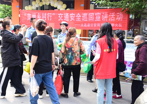 四川新闻网成都4月26日讯 为进一步增强农村地区群众交通安全意识、法治意识和文明意识,强化农村地区交通安全宣传,深入推进“美丽乡村行”交通安全巡回宣传活动,4月26日上午,大邑县公安局交通警察大队来到辖区沙渠街道利民小区街集市,以乡镇赶集日为契机持续开展“美丽乡村行”交通安全巡回宣传,全力维护农村道路交通安全形势稳定,预防和减少农村道路交通事故发生。