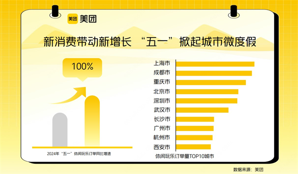 ▲“五一”假期,美团休闲玩乐订单量同比翻倍增长。