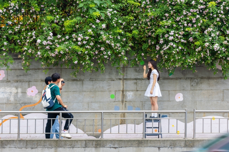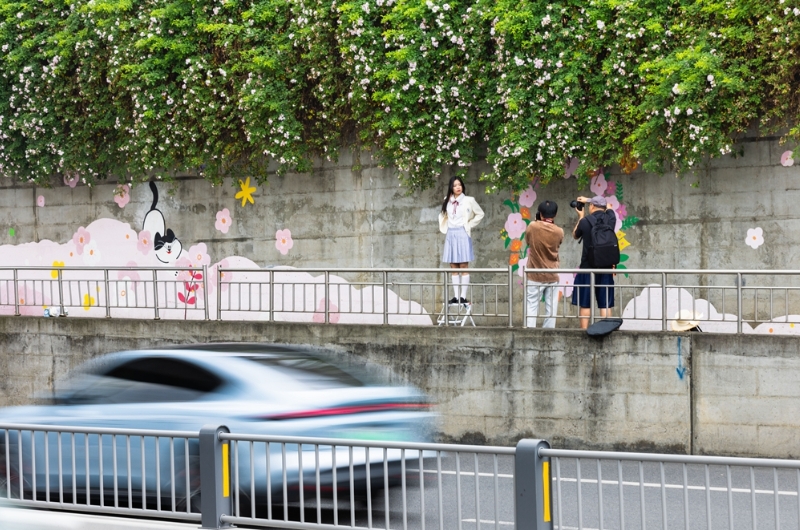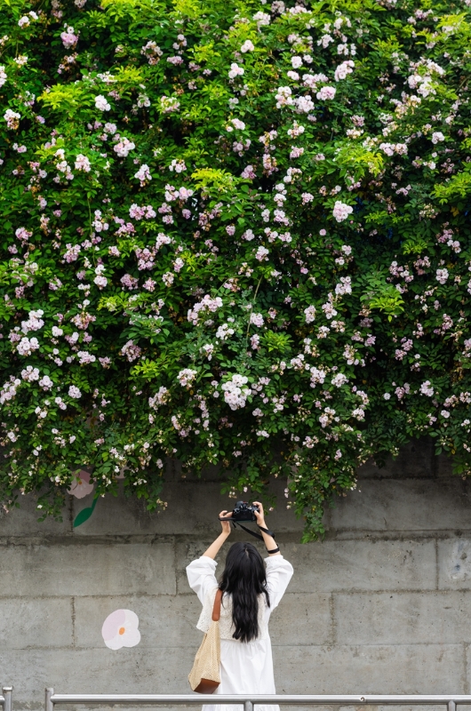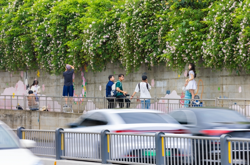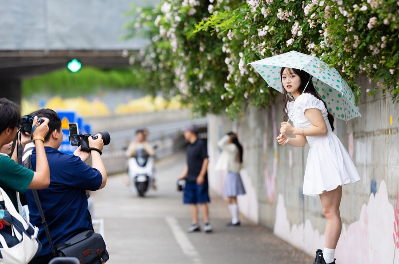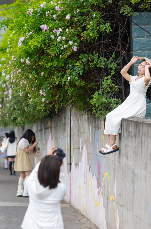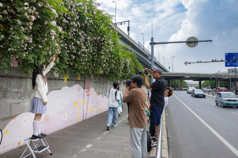 位于神仙树高架桥下的锦明路是连接南三环与剑南大道的重要通道,这条平日里并不引人注目的下穿路,近期也因美而火,繁星般的蔷薇挂于路墙,远远望去好似一条鲜花瀑布,拍照打卡的游客摩肩接踵好不热闹。