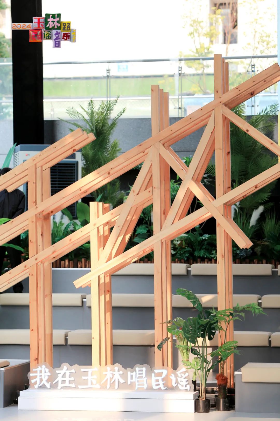 在发布会现场,如星星般闪烁的“玉林之树”吸引了不少观众的目光。据介绍,舞台提取了树的元素,加入了具有成都地域风格的屋檐形式,让舞台呈现出民谣音乐超级现场的沉浸感。“我们借鉴学习了‘村BA’‘村超’的特点,创造性地打造了具有沉浸式包围感的城市‘音超’现场,这是属于成都玉林的民谣音乐超级现场。”罗邴文表示。