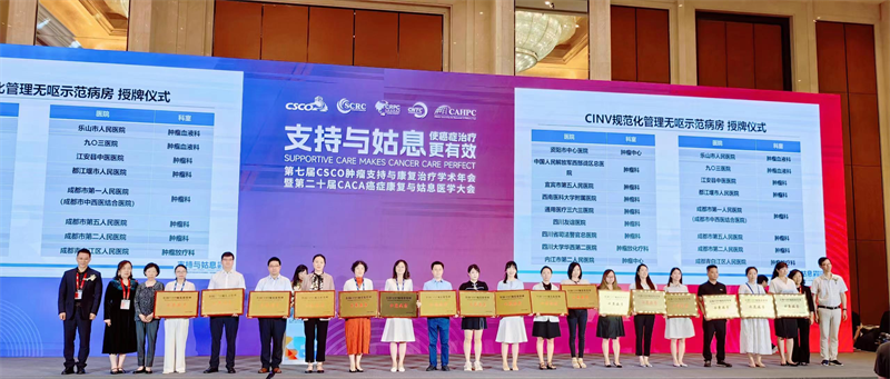四川新闻网成都6月25日讯 近日,在第七届CSCO肿瘤支持与康复治疗学术年会暨第二十届CACA癌症康复与姑息医学大会上,成都市青白江区人民医院肿瘤放疗科通过大会评审专家组评审,成功创建“全国CINV规范化管理示范病房”。青白江区人民医院肿瘤放疗科主任方红接受授牌。