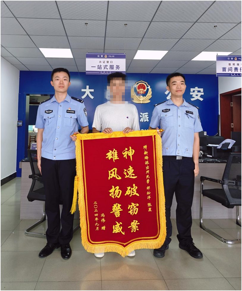 近日,新场辖区群众冯先生将一面写有“神速破窃案,雄风扬警威”的锦旗送到大邑公安新场派出所,并激动地说:“破案神速,你们派出所的警官真心实意为人民群众办实事,让我们感到心安、温暖。”