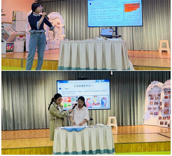 赖奕芃的妈妈和老师姗姗以生动形象、深入浅出的方式向大家介绍了扎染的历史渊源、文化内涵以及基本原理与技巧。大家都全神贯注地聆听,眼中闪烁着对扎染这一传统工艺的好奇与渴望。