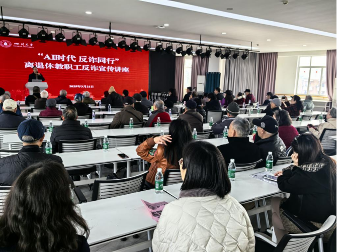 此次宣传讲座,由徽商银行成都分行发起,联合成都市公安局武侯分局、四川大学离退休处共同开展。活动现场,武侯区公安局反诈中心民警从电信网络诈骗的危害入手,结合近年来的典型真实案例,用生动形象的语言讲解当前高发的电信诈骗、网络贷款诈骗、虚假投资理财等典型案例,通过展示“刷单返利”“冒充公检法”“贷款刷流水”等诈骗的常见套路,引导广大离退休教职工识破诈骗骗局。